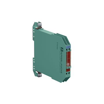 2-kanałowa iskrobezpieczna bariera Zenera firmy Pepperl+Fuchs, wersja DC, dodatnia polaryzacja, napięcie robocze 26,5V przy 10 µA, rezystancja szeregowa max. 327 OHM, zabezpieczenie 50 mA, montaż na szynie DIN
