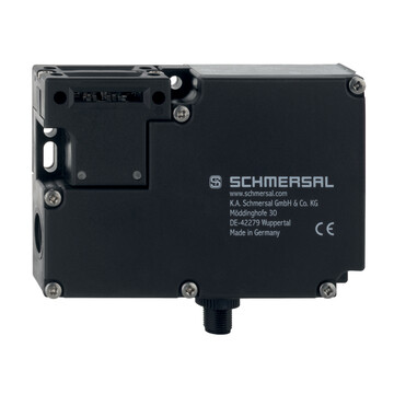 Elektromagnetyczna blokada bezpieczeństwa Schmersal do Safety-Fieldbox, siła ryglowania 2600 N, IP67, obudowa termoplastyczna, podłączenie M12 8-pin, napięcie sterowania 24 VAC/DC, 2 styki bezpieczeństwa, wymiary 130x90x30 mm.