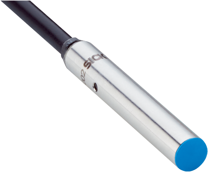 Indukcyjny czujnik zbliżeniowy SICK, standardowa obudowa, zasięg 2 mm, montaż w jednej płaszczyźnie, DC 3-przewodowe, NPN, NO, przewód 2 m, wskaźnik ustawienia, IP67.