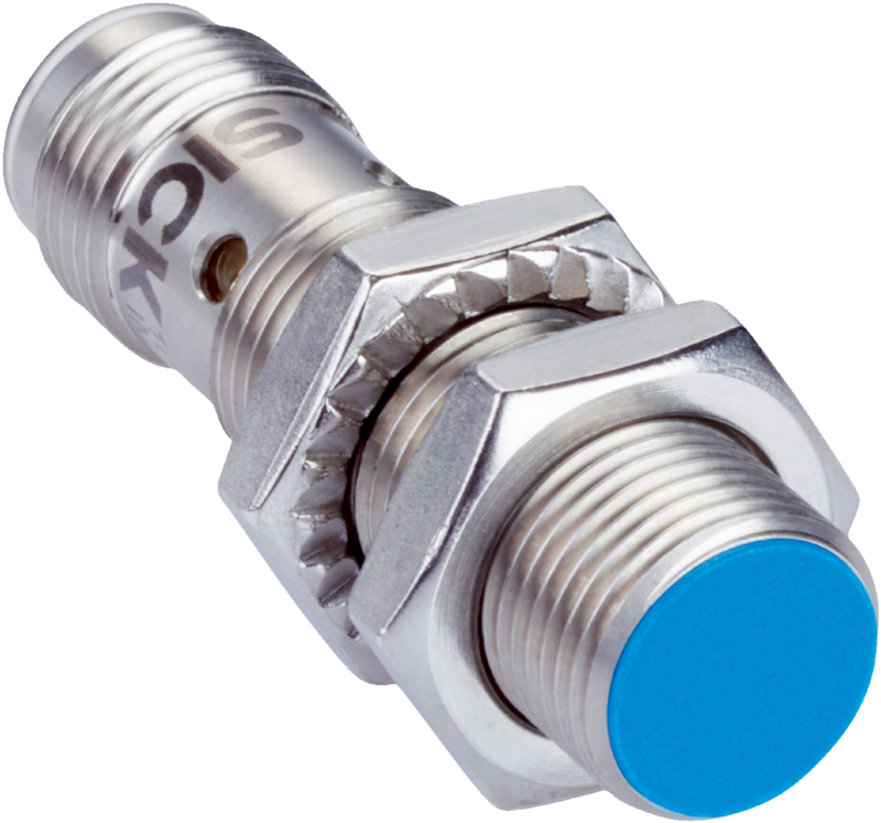 Indukcyjny czujnik zbliżeniowy SICK, korpus krótki, zasięg 4 mm, DC 3-przewodowe, NPN, styk NO, IP68/IP69K, odporność na płyny chłodzące i smarujące, wskaźnik ustawienia, wytrzymały termicznie, wtyk M12.