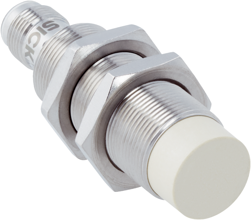 Indukcyjny czujnik zbliżeniowy SICK do stref higienicznych i mokrych, zakres: 12 mm, standardowa obudowa M18, NPN, NO, DC 3-przewodowy, stal nierdzewna V4A, IP68/IP69K, odporny na środki czyszczące.
