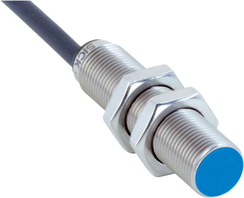 Indukcyjny czujnik zbliżeniowy SICK, standardowa obudowa, zakres 4 mm, montaż w jednej płaszczyźnie, wyjście NPN NO, przewód PUR 2 m, IP67/IP68/IP69K, temperatura -40°C...+85°C.