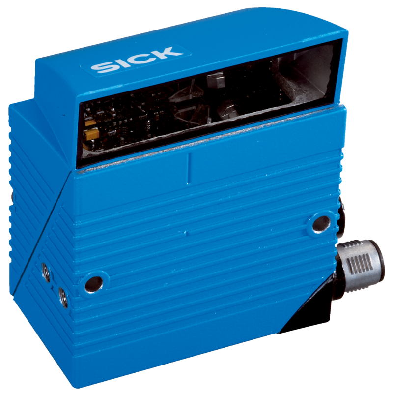Stacjonarny czytnik kodów kreskowych SICK, skaner rastrowy, odczyt boczny do 365 mm, rozdzielczość 0,2–1 mm, IP65, interfejsy Ethernet i CAN, złącze M12.