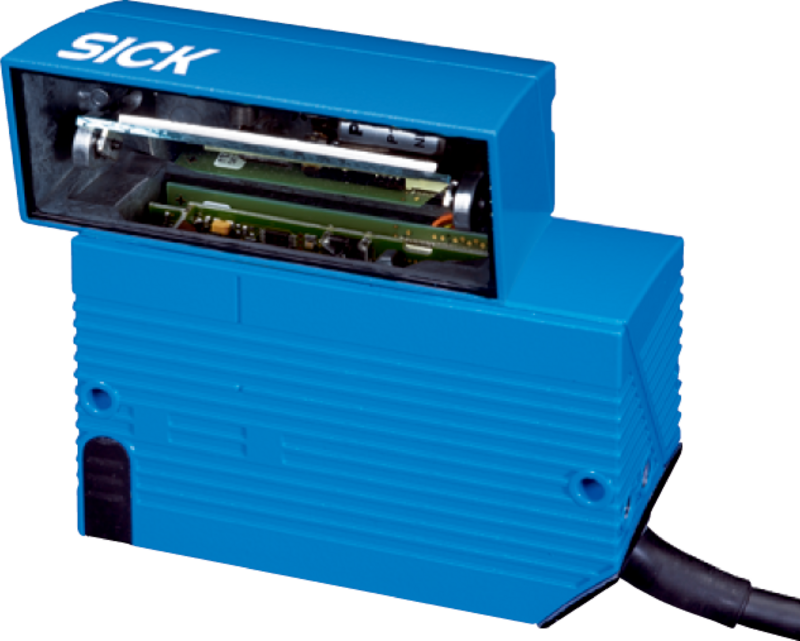 Stacjonarny czytnik kodów kreskowych SICK, skaner liniowy, stała ogniskowa, ochrona IP65, przewód 0,9 m, zasięg odczytu do 659 mm, rozdzielczość 0,35–1 mm.