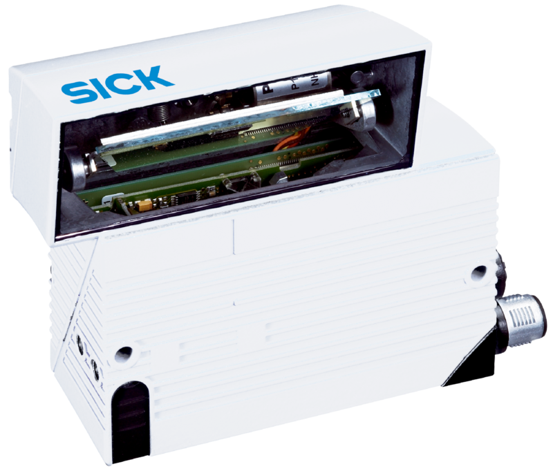 Stacjonarny czytnik kodów kreskowych SICK, wahliwe lustro, autofokus, laser czerwony 658 nm, rozdzielczość 0,25–1 mm, odległość do 1570 mm, IP65, aluminiowa obudowa, Ethernet/PROFINET/EtherCAT.