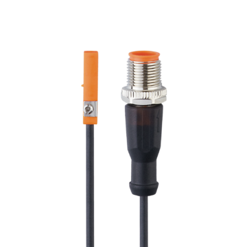 Czujnik magnetyczny do zabudowy na siłowniku firmy IFM, obudowa kostkowa 25 x 5 x 6,5 mm, montaż zabudowany, zasilanie 10-30VDC, PNP/NO, przewód 0,3 m PUR z gniazdem M12