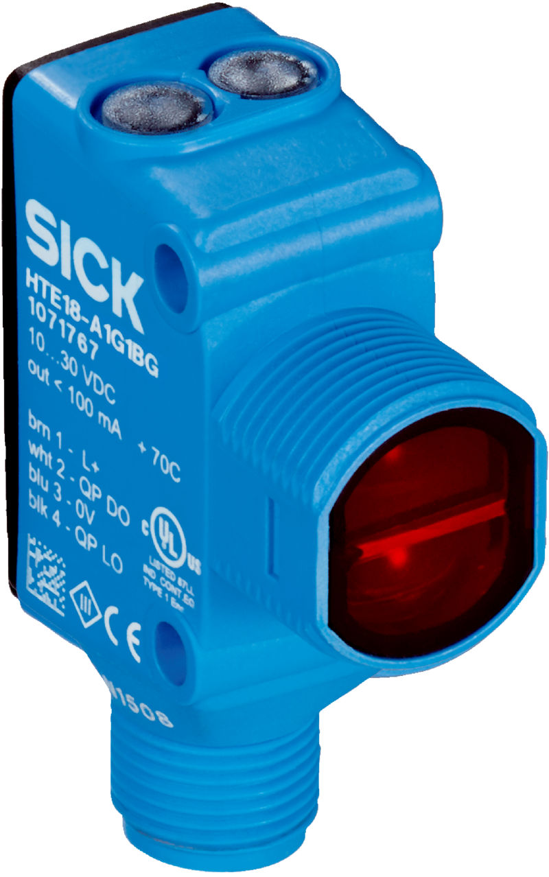 Fotoprzekaźniki, H18 Sure Sense, HTB18-B4A2AB, Wersja urządzenia: Standard, Interfejs komunikacyjny: -, Sposób zamocowania: M18, głowica/z boku (24,1 … 25,4 mm), Zasada działania czujnika/ zasada detekcji: Fotoprzekaźnik odbiciowy, Tłumienie tła, Zasięg wykrywania: 300 mm, Nadajnik światła, rodzaj światła: Nadajnik PinPoint, widzialne światło czerwone, Rodzaj napięcia: DC, Wyjście przełączające Q1: PNP, Załączany przez światło, Wyjście przełączające Q2: NPN, Załączany przez światło, Potencjometr, z prawej strony: Zasięg wykrywania, Potencjometr, z lewej strony: Brak, Typ przyłącza: Wtyk M12, 4-pinowy