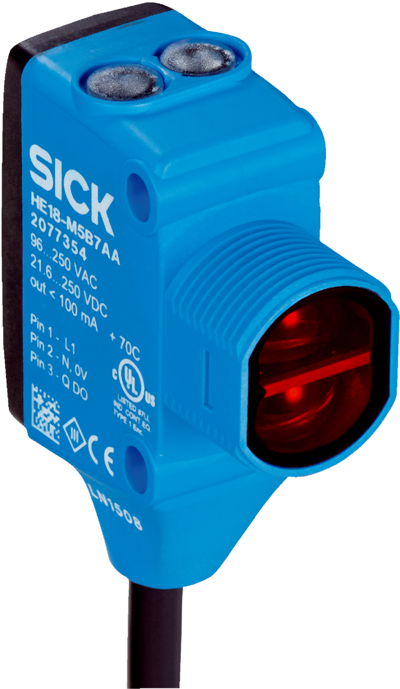 Fotoprzekaźniki, H18 Sure Sense, HTB18-M1G2AAD02, Wersja urządzenia: Standard, Interfejs komunikacyjny: -, Sposób zamocowania: M18, głowica/z boku (24,1 … 25,4 mm), Zasada działania czujnika/ zasada detekcji: Fotoprzekaźnik odbiciowy, Tłumienie tła, Zasięg wykrywania: 300 mm, Nadajnik światła, rodzaj światła: Nadajnik PinPoint, widzialne światło czerwone, Rodzaj napięcia: AC/DC, Wyjście przełączające Q1: MOSFET, Załączany przez ciemność, Potencjometr, z prawej strony: Brak, Potencjometr, z lewej strony: Brak, Typ przyłącza: Przewód, końcówka otwarta, 2 m