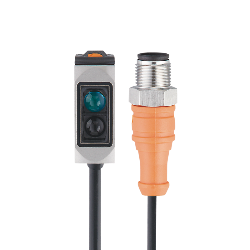 Czujnik optyczny odbiciowy z eliminacja wpływu tła firmy IFM, obudowa kostkowa 35 x 13 x 21 mm, zasięg = 2 … 200 mm, PNP / NO lub NC, zasilanie 10- 30 VDC, przewód 0,3 z gniazdem M12, IP68/IP69K, aplikacje spożywcze