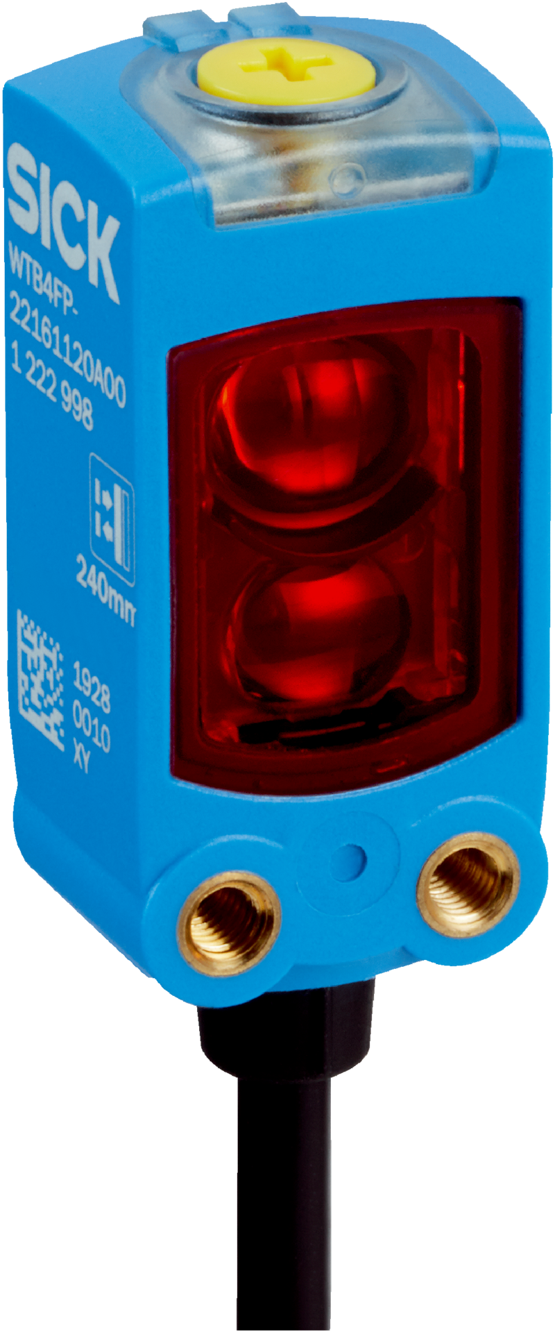 Fotoprzekaźnik odbiciowy SICK, zakres 4–220 mm, wyjście Push-Pull PNP/NPN, światło czerwone, przewód 2m, potencjometr, Teach-in, do pracy w trudnych warunkach przemysłowych.