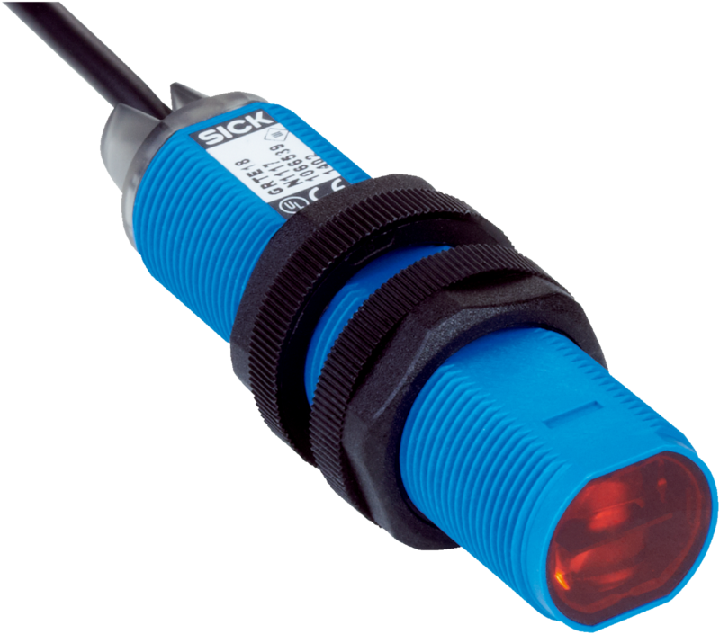 Fotoprzekaźnik odbiciowy SICK, światło IR, zakres wykrywania 10-800 mm, wyjście PNP, przewód 5 m, tryb jasny/ciemny, IP67, potencjometr, korpus M18x1.