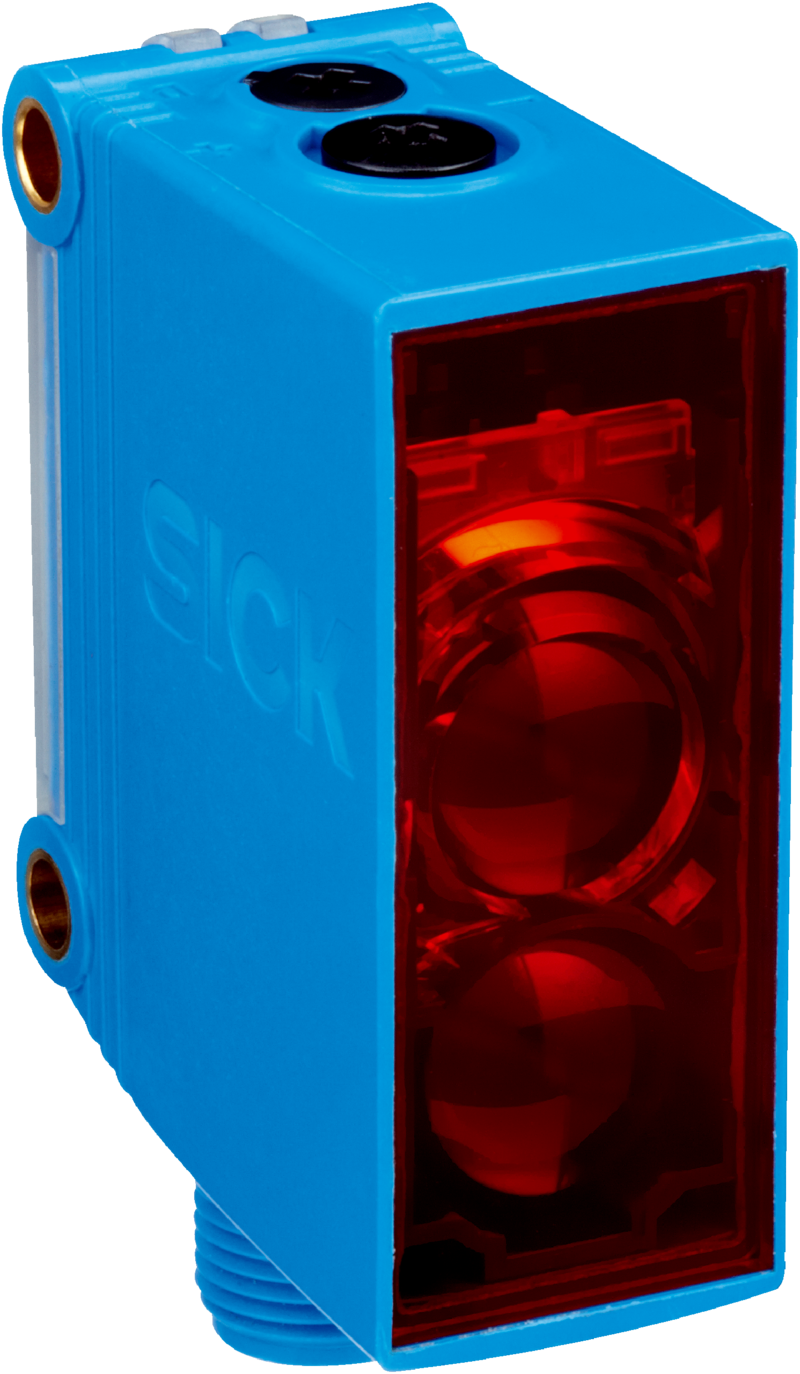 Fotoprzekaźnik odbiciowy SICK, wyjście PNP, tłumienie tła, zakres 20–1200 mm, światło podczerwone, wyjście M12 4-pinowe, IP67, regulacja potencjometrem, tryb jasność/ciemność.