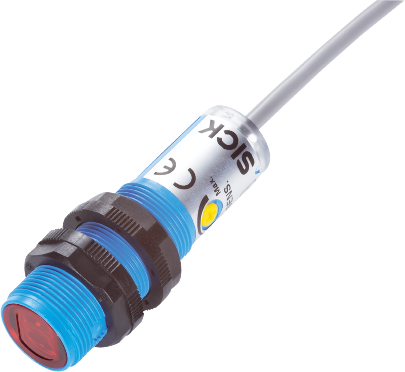 Fotoprzekaźnik odbiciowy SICK, NPN, energetyczny, zasięg 1-1100 mm, przewód 4-żyłowy 2 m, potencjometr, światło czerwone, obudowa PBT/PC, IP67.