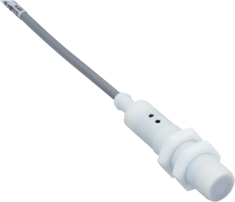 Pojemnościowy czujnik zbliżeniowy SICK, zasięg 3...8 mm, średnica 18 mm, wyjście NPN komplementarne, przewód 2 m, obudowa PTFE, IP67, potencjometr, przeznaczony do środowisk chemicznych.