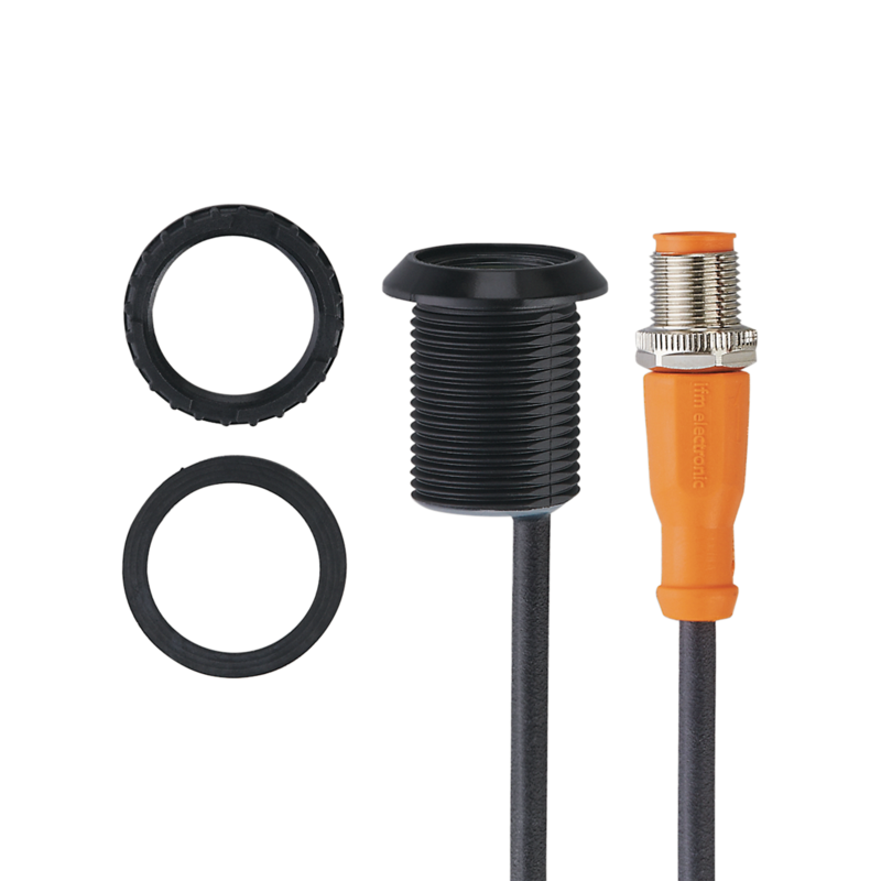Pojemnościowy przycisk dotykowy firmy IFM, obudowa cylindryczna średnica 29, 3...20 mm montaż niezabudowany, zasilanie 10-30 VDC, PNP /NO, podłączenie elektryczne przewód 0,3 m PUR z gniazdem M12, L = 31 mm