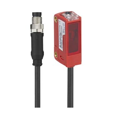 Czujnik refleksyjny spolaryzowany firmy LEUZE, wykrywanie przeźroczystych butelek; wyk. spec.: kolimacja, funkcja śledzenia; zakres: 0 ... 0,5 m; światło: laserowe; zasilanie 10-30V DC; wyjście1: PNP/NO; 3.000 Hz; przewód 200 mm z gniazdem M8-4pin