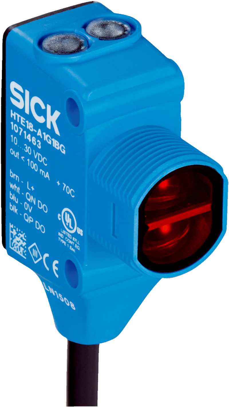 Fotoprzekaźniki, H18 Sure Sense, HL18-B1E3BB, Wersja urządzenia: Standard, Interfejs komunikacyjny: -, Sposób zamocowania: M18, głowica/z boku (24,1 … 25,4 mm), Zasada działania czujnika/ zasada detekcji: Fotoprzekaźnik refleksyjny, Z odstępem minimalnym od odbłyśnika (układ dwusoczewkowy), Zasięg wykrywania: 6,5 m, Nadajnik światła, rodzaj światła: Nadajnik PinPoint, widzialne światło czerwone, Rodzaj napięcia: DC, Wyjście przełączające Q1: PNP, Załączany przez światło, Wyjście przełączające Q2: NPN, Załączany przez światło, Potencjometr, z prawej strony: Czułość, Potencjometr, z lewej strony: Brak, Typ przyłącza: Przewód, końcówka otwarta, 1 m