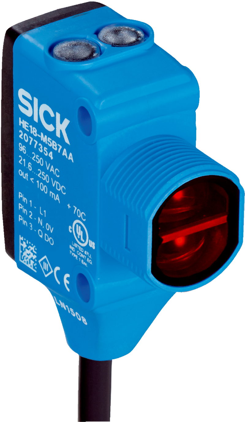 Fotoprzekaźniki, H18 Sure Sense, HL18-M1G2AB, Wersja urządzenia: Standard, Interfejs komunikacyjny: -, Sposób zamocowania: M18, głowica/z boku (24,1 … 25,4 mm), Zasada działania czujnika/ zasada detekcji: Fotoprzekaźnik refleksyjny, Z odstępem minimalnym od odbłyśnika (układ dwusoczewkowy), Zasięg wykrywania: 6,5 m, Nadajnik światła, rodzaj światła: Nadajnik PinPoint, widzialne światło czerwone, Rodzaj napięcia: AC/DC, Wyjście przełączające Q1: MOSFET, Załączany przez ciemność, Potencjometr, z prawej strony: Czułość, Potencjometr, z lewej strony: Brak, Typ przyłącza: Przewód, końcówka otwarta, 2 m