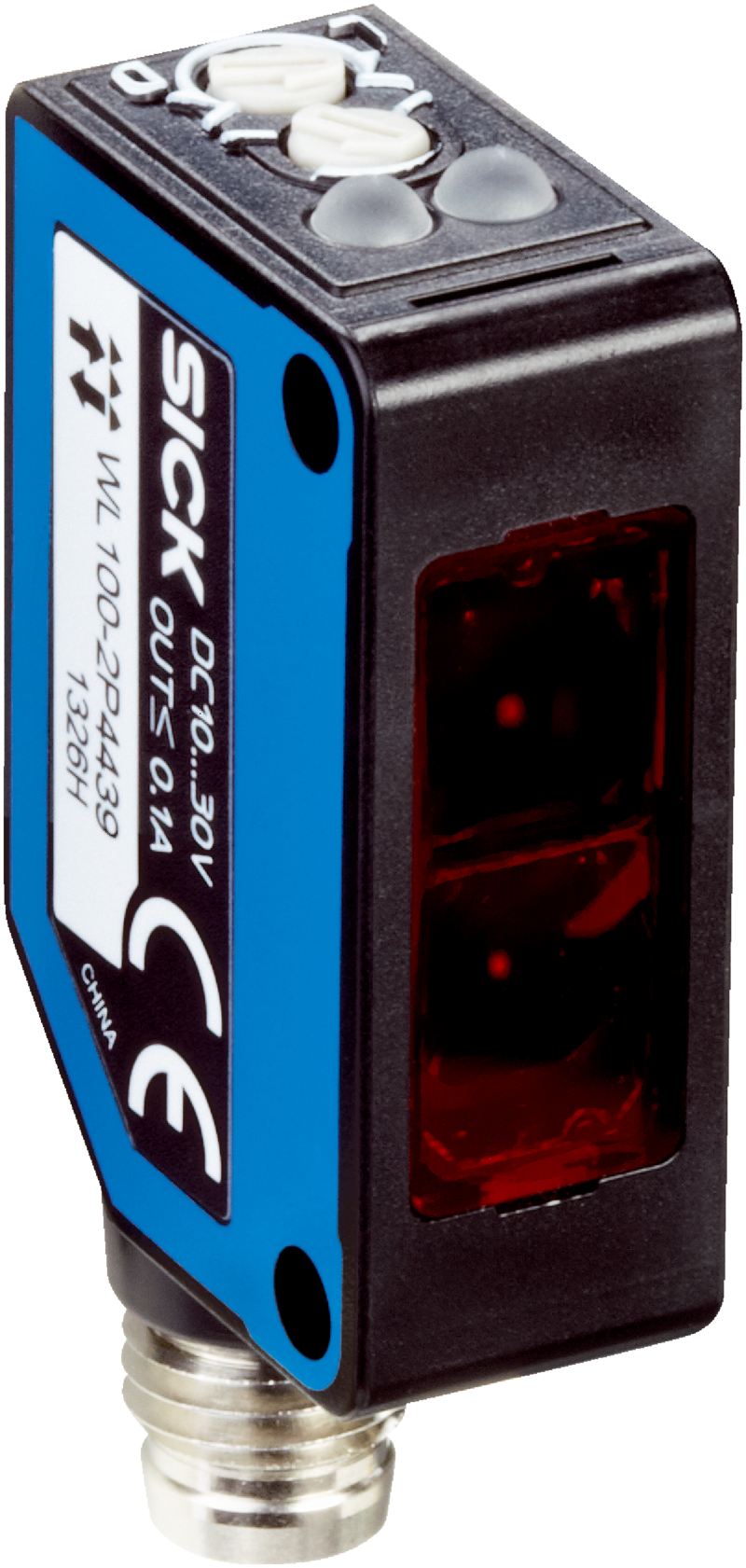 Fotoprzekaźniki, W100-2, WL100-2P3432, Zasada działania: Fotoprzekaźnik refleksyjny, Szczegóły zasady działania: Z odstępem minimalnym od odbłyśnika (układ dwusoczewkowy), Wyjście przełączające: PNP, Tryb przełączania: Załączany na jasno/ciemno, Typ przyłącza: Wtyk M8, 3-pinowy, Nadajnik światła: LED, Rodzaj ustawiania: Potencjometr, Interfejs komunikacyjny: -