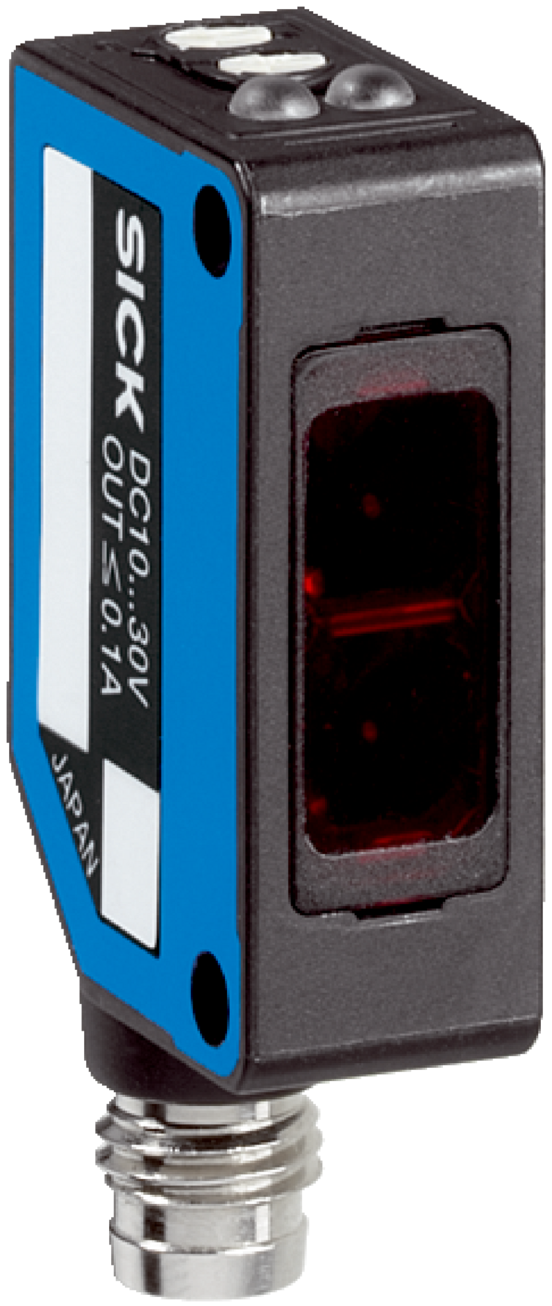 Fotoprzekaźnik refleksyjny SICK, klasa lasera 1, PNP, wtyk M8 3-pinowy, zakres wykrywania 0,08–12 m, filtr polaryzacyjny, czerwone światło 650 nm, IP65, ustawianie potencjometrem.