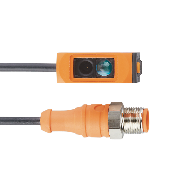 Czujnik optyczny laserowy typu bariera firmy IFM, odbiornik, kostka 35 x 13 x 21 mm, zasięg = 15 m, NPN/NO lub NC, IO-Link, zasilanie 10 - 30 VDC, przewód 0,3 m z gniazdem M12