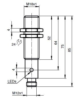 Czujnik ultradźwiękowy Pepperl+Fuchs, typ odbiciowy, średnica M18, sn=30-500 mm, wyjście częstotliwościowe, zasilanie 10-30 VDC, konektor M12, odpowiedź = 10Hz, IP67, L=85 mm, synchronizacja, wybór szerokości wiązki