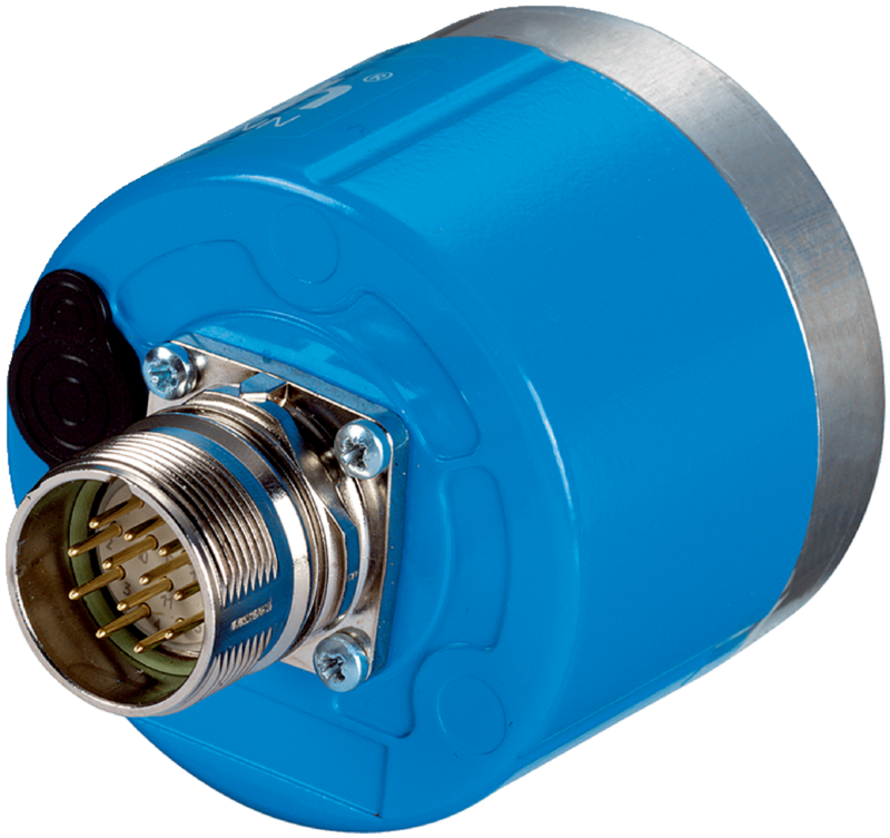 Enkoder absolutny SICK, otwór nieprzelotowy 15 mm, równoległy, 360 kroków, wtyk M23, IP65, napięcie 10–32 V, przeznaczony do kontroli ruchu w automatyce.