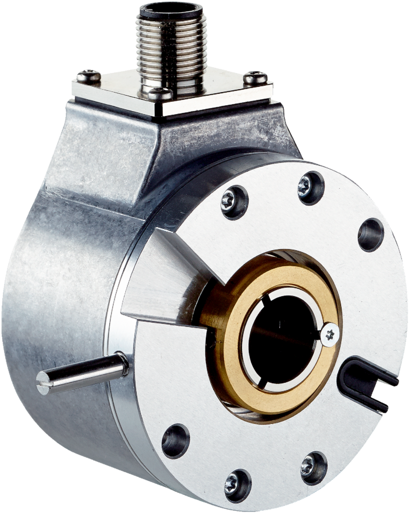 Enkoder inkrementalny SICK, otwór przelotowy 5/8", interfejs: 4,5–5,5 V, TTL, RS-422, 1024 impulsów/obrót, wtyk M12 8-pin, montaż na kołki, IP65, temp. pracy –20°C do +85°C.