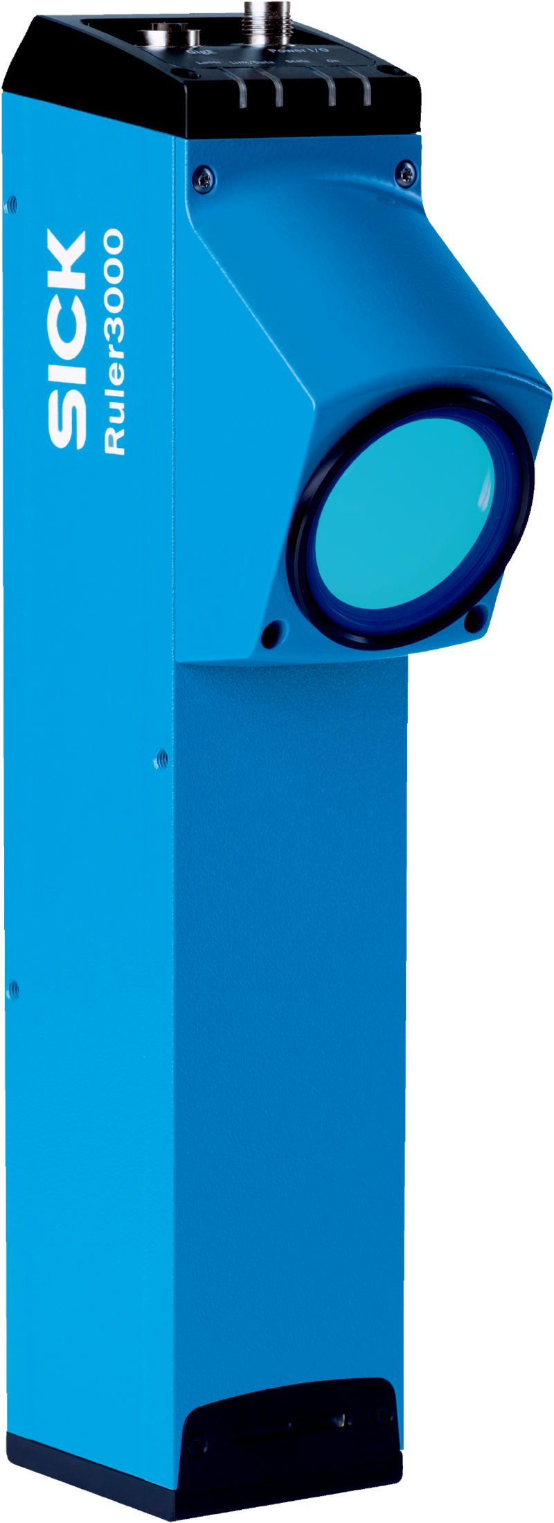 Czujnik 3D SICK Ruler3000, CMOS, laser czerwony 660 nm, klasa 3R, zakres pracy 395–815 mm, rozdzielczość Z 20–71 µm, IP65/IP67, pole widzenia 500x290 mm.
