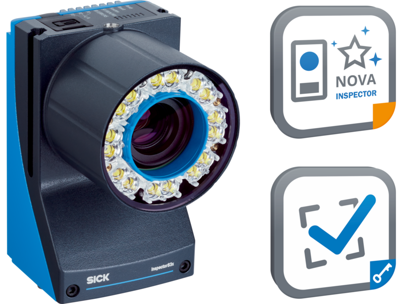 System wizyjny SICK, monochromatyczny CMOS 5,1 Mpix, obiektyw C-Mount 12 mm, licencja Intelligent Inspection, zasięg 200–2500 mm, IP65, podświetlenie białe zintegrowane.