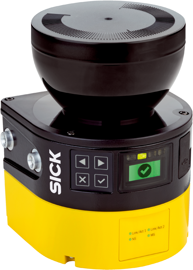 Laserowy skaner bezpieczeństwa SICK, EFI-pro, zasięg pola ochronnego 4 m, 8 pól, obsługa Ethernet/IP, zasilanie 24 VDC, kompaktowa budowa.