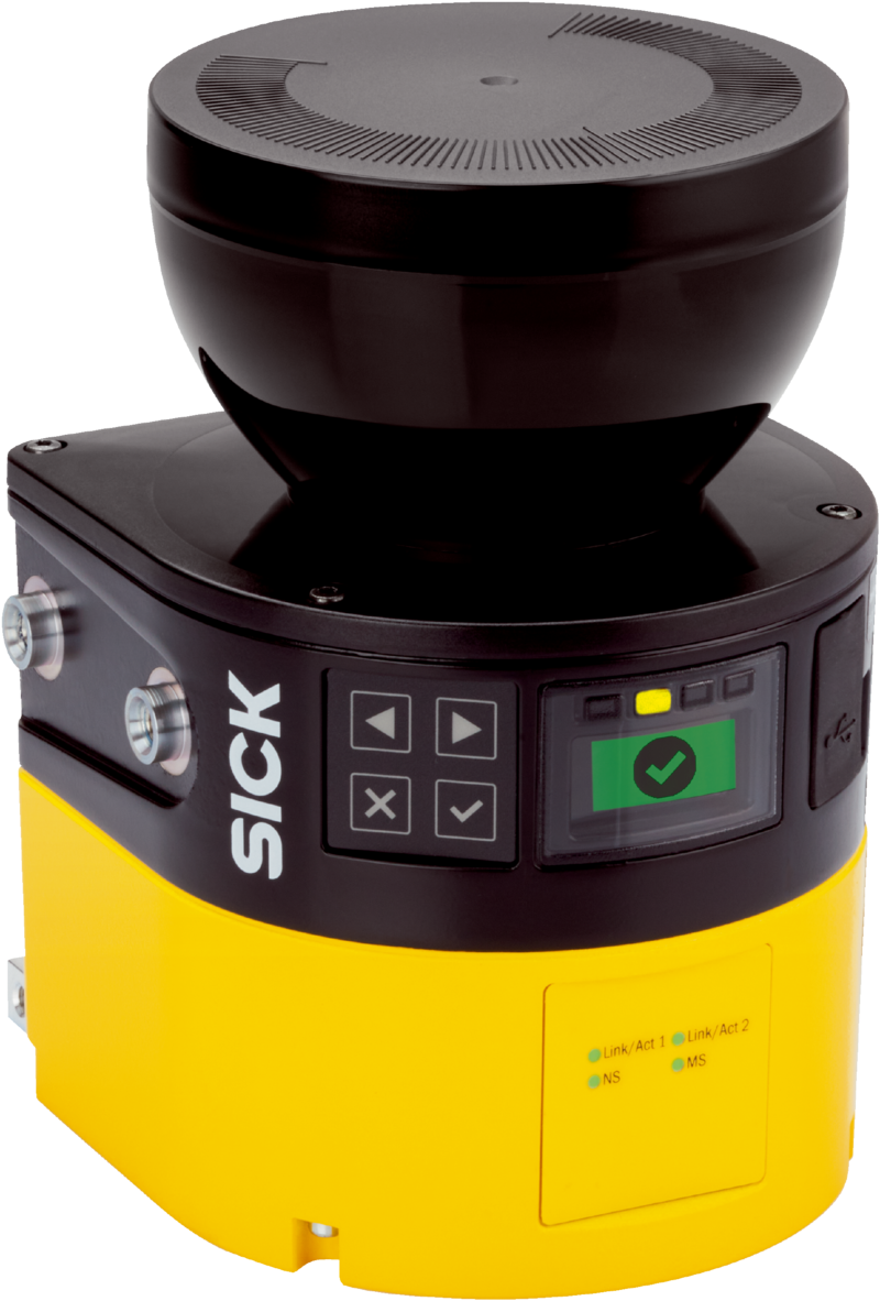 Laserowy skaner bezpieczeństwa SICK, zasięg pola ochronnego 9 m, 275° skanowania, 128 pól, kategoria 3, zasilanie 24 VDC, wyjścia OSSD 4, konfigurowalna rozdzielczość 30–200 mm, stopień ochrony IP65.