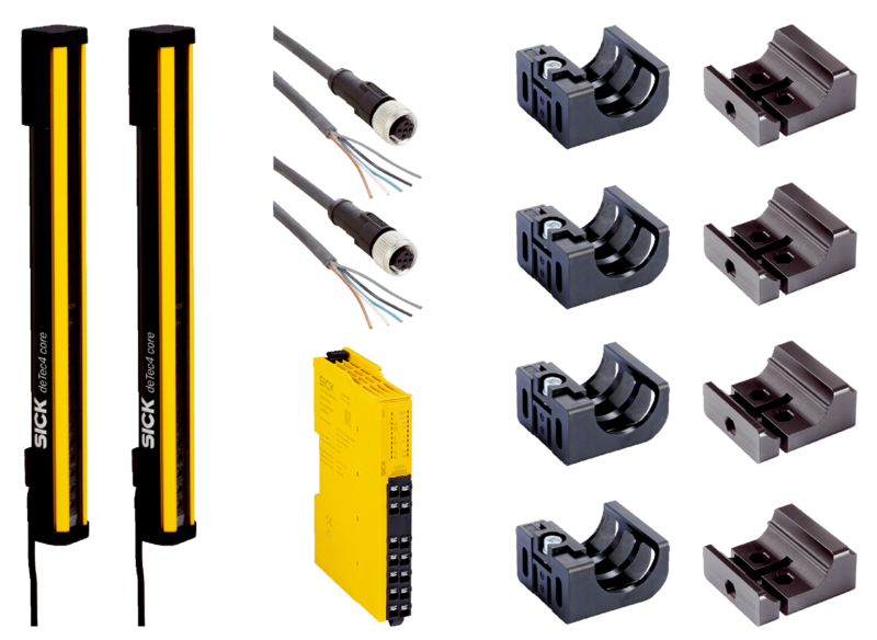 Optoelektroniczne kurtyny bezpieczeństwa, deTec, deTec4 Core Set 14/450, Wersja produktu: deTec4 Core, Część systemowa: Zestaw, Obszar zastosowania: Standardowe środowisko przemysłowe, Poziom bezpieczeństwa: PL e, SIL 3, Typ 4, Rozdzielczość: 14 mm, Zasięg: 10 m, Wysokość pola ochronnego: 450 mm, Typ przyłącza: Wtyczka M12, 5-pinowa, Stopień ochrony: IP65IP67, Zakres dostawy: NadajnikOdbiornik4 uchwyty FlexFix4 uchwyty QuickFix2 przewody podłączeniowe, 5 mPręt kontrolny o średnicy odpowiadającej rozdzielczości optoelektronicznej kurtyny bezpieczeństwaPrzekaźnik bezpieczeństwa RLY3-OSSD2Instrukcja bezpieczeństwaInstrukcja montażuInstrukcja eksploatacji do pobrania