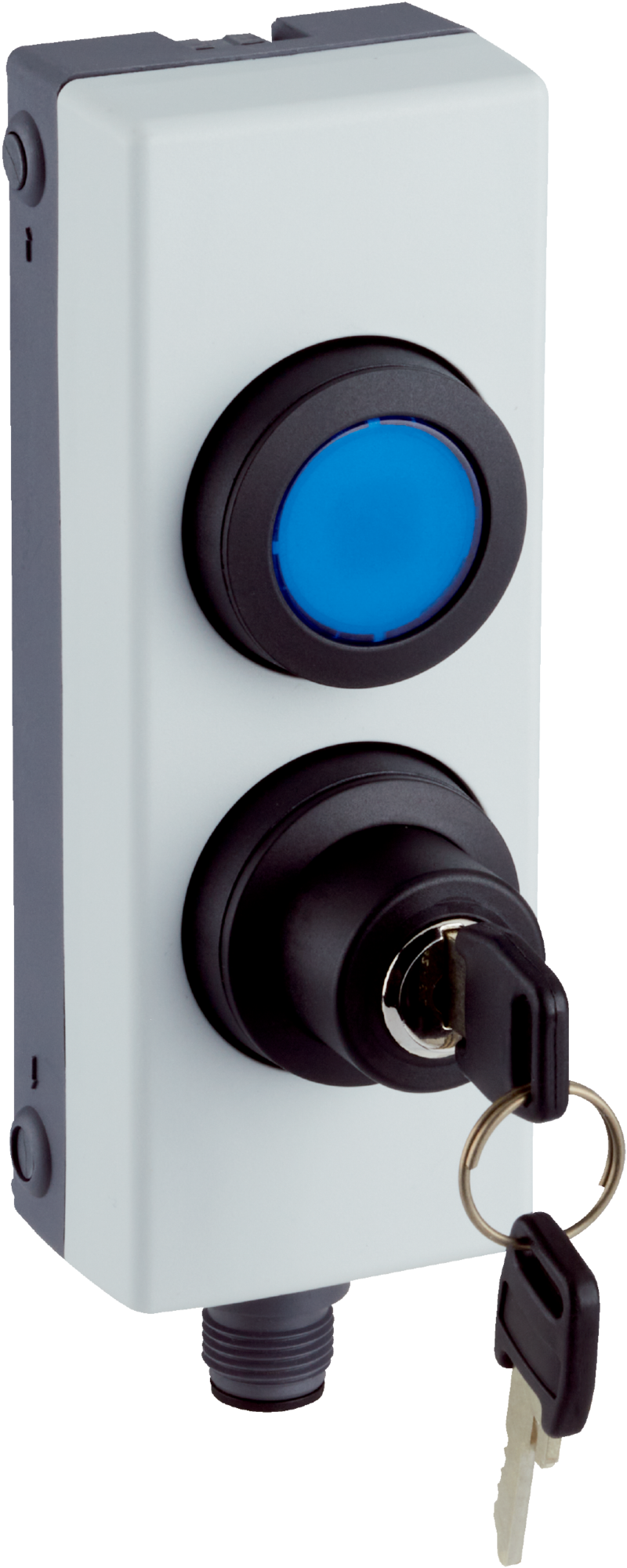 Wyłącznik bezpieczeństwa SICK, dwuprzyciskowy, 2 NO, złącze M12 5-pinowe, przycisk kluczykowy, przycisk LED, IP65, obsługa mutingu, obudowa PBT, pobór 14 mA, temp. -25°C do +70°C.