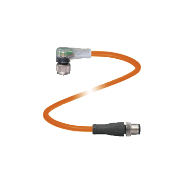 | Cordset M12 socket angled A-coded LED 4-pin to M12 plug straight A-coded 4-pin, POC cable welding-bead resistant orange, suitable for robotic applications, torsion resistant, oil resistant, molecularly cross-linked |