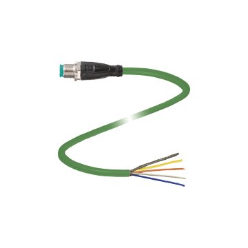 | Ethernet bus cable male cordset single-ended M12 straight D-coded 4-pin, PUR cable green, Cat5e, shielded, drag chain suitable, UL approved |