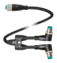 | Y connection cable M12 socket straight A-coded 4-pin to 2x M12 plug angled A-coded 4-pin, 3x PUR cable black, UL approved, drag chain suitable, torsion resistant |