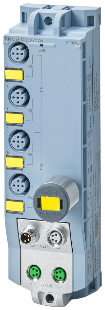 Moduł Siemens 6ES7146-5FF00-0BA0 to cyfrowy moduł fail-safe F-DI 4 + F-DQ 2 z serii ET 200AL, zaprojektowany do realizacji funkcji bezpieczeństwa. Posiada cztery wejścia cyfrowe oraz dwa wyjścia cyfrowe o napięciu 24 V DC i dopuszczalnym prądzie do 2 A, z połączeniami typu M12. Moduł obsługuje klasy bezpieczeństwa kategorię 3, PL d przy pojedynczym wejściu oraz kategorie 4, PL e przy trybach dwukanałowych, oraz SIL 2 / SIL 3 zgodnie z normą IEC 61508.