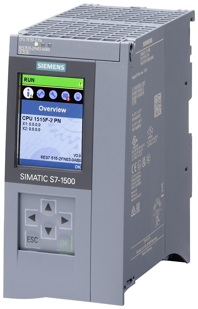 SIMATIC S7-1500, JEDNOSTKA CENTRALNA FAIL-SAFE CPU 1515F-2 PN, PAMIĘĆ WORK: 1.5 MB NA PROGRAM I 4.5 MB NA DANE, INTERFEJSY: PROFINET/ETHERNET (SWITCH 2 X RJ45; OBSŁUGA TRYBU IRT), ETHERNET (1 X RJ45); PRZETWARZANIE OPERACJI BITOWYCH: 6 NS