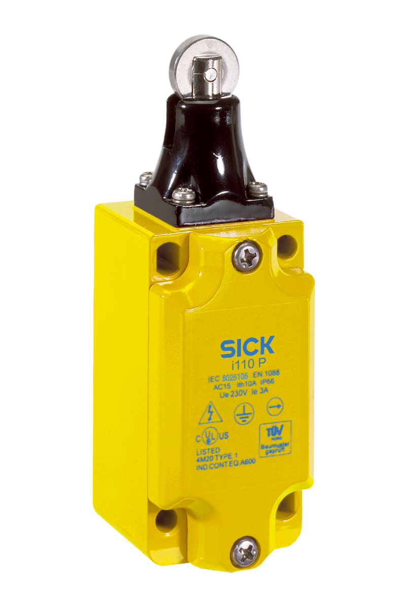 Elektromechaniczny wyłącznik bezpieczeństwa SICK, metalowa obudowa, aktywator rolkowy, 2NC+2NO, siła napędowa ?11 N, ochrona IP66, 4 kierunki aktywacji, napięcie robocze 3A/240V AC, certyfikaty TÜV, cULus.