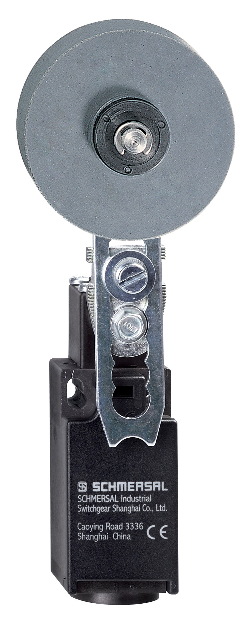 Wyłącznik pozycyjny Schmersal do pozycjonowania, obudowa z tworzywa, metalowa dźwignia, rolka tworzywo, IP65/IP67, wymiar 49x158,5x30 mm, prąd 10 A, temp. -30°C do +80°C.